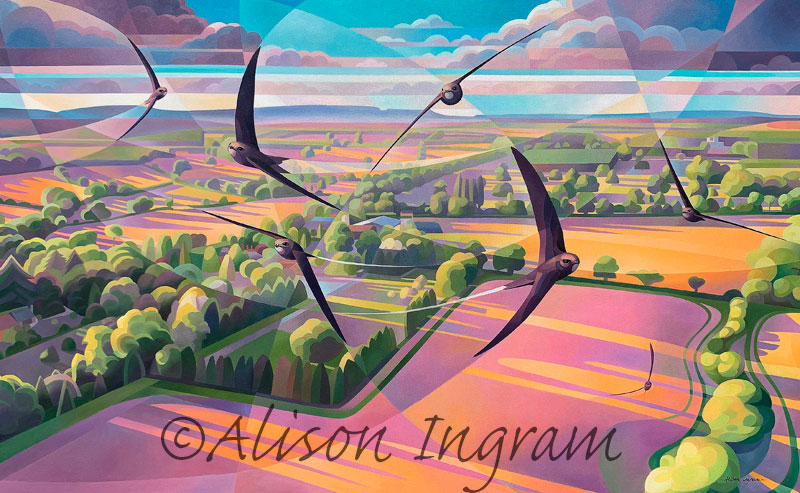 Swifts are Alison’s favourite bird. Swifts over Broomlands Farm depicts Alison’s home and surrounding area on a warm summer evening. There used to be a large swift colony in the farmhouse roof until the nests were destroyed with roof repairs. However some swifts then made a home in the the farmhouse roof next door to Alison, at Bailing Hill.