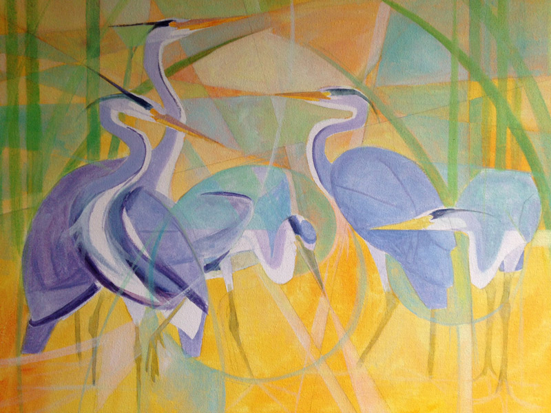 Siege of Herons II as a work in progress. This painting is in it’s very early stages with the composition just completed and the design starting to develop. At this stage I am still working out where to bring lines and arcs through the painting while building up the reeds in the background. I thoroughly enjoyed painting the first version of Siege of Herons a couple of years ago and felt it was time to explore the idea again. The first painting sold at it’s first showing so I expect the second version to be just as popular. The painting can be reserved at this stage although I may enter into exhibitions in the U.S so it may not be available until later in the year.
